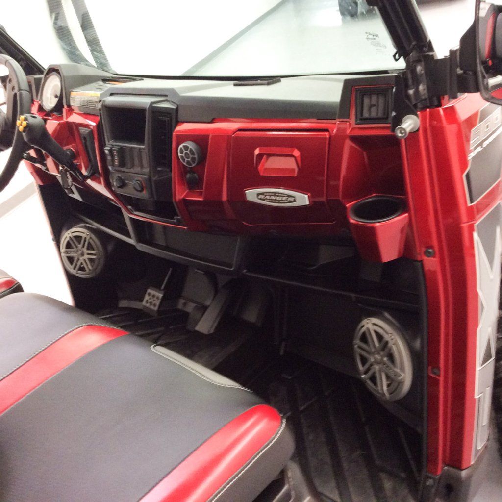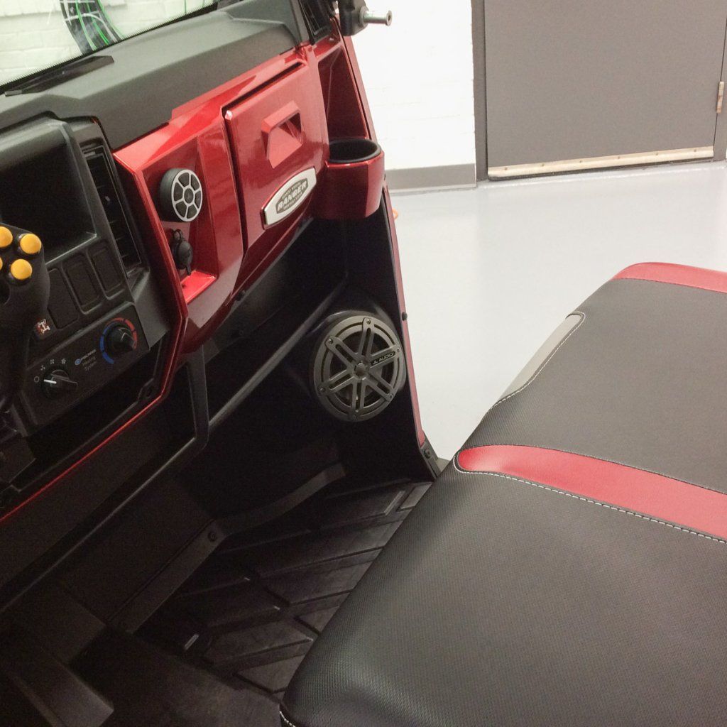 Spring is finally here! In this 2015 Polaris Ranger xp900, the client wanted some serious sound that would cut out the road noise. To accomplish just that, we added 2 JL Marine 6.5in speakers into custom kick panels, a JL W1v3 10in subwoofer into a custom enclosure under the passenger side seat, a JL Audio Marine grade 3 channel amp to power the speakers and subwoofer, and a Bluetooth receiver to control everything. We also added a second battery under the subwoofer to provide the extra juice this system requires (not photographed).